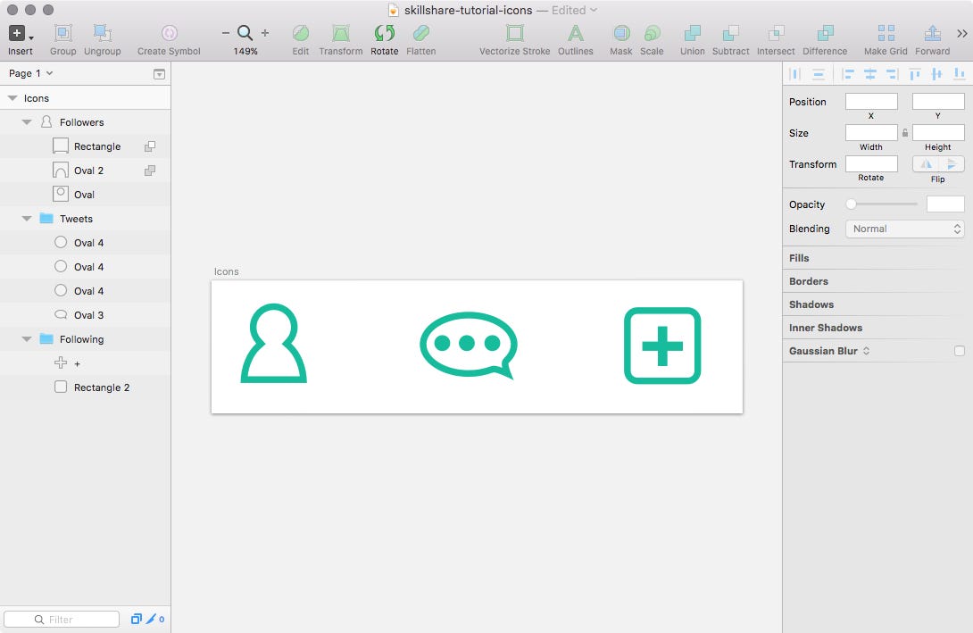 As a last step we should tidy up the layers of the icons in the Layer's List (the left area of Sketch) and move them into a logical order. So select the first icon, drag it to the top of the Layers List and rename it to "Followers" with cmd + R. Then select all the shapes of the second icon (remember to hold shift), press cmd + G to group them, rename the group to "Tweets" and drag it just below the first icon in the Layers List. Do the same for the "Following" icon — select both the rounded rectangle and the "+" and press cmd + G –, name it accordingly and drag it to the bottom of the artboard in the Layers List.